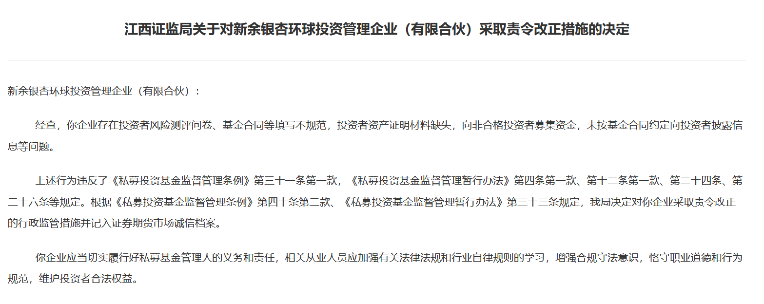 基于上述违规行为,根据《私募投资基金监督管理条例》第四十条第二款、《私募投资基金监督管理暂行办法》第三十三条规定,江西证监局决定对新余银杏环球投资管理企业(有限合伙)采取责令改正的行政监管措施并记入证券期货市场诚信档案。